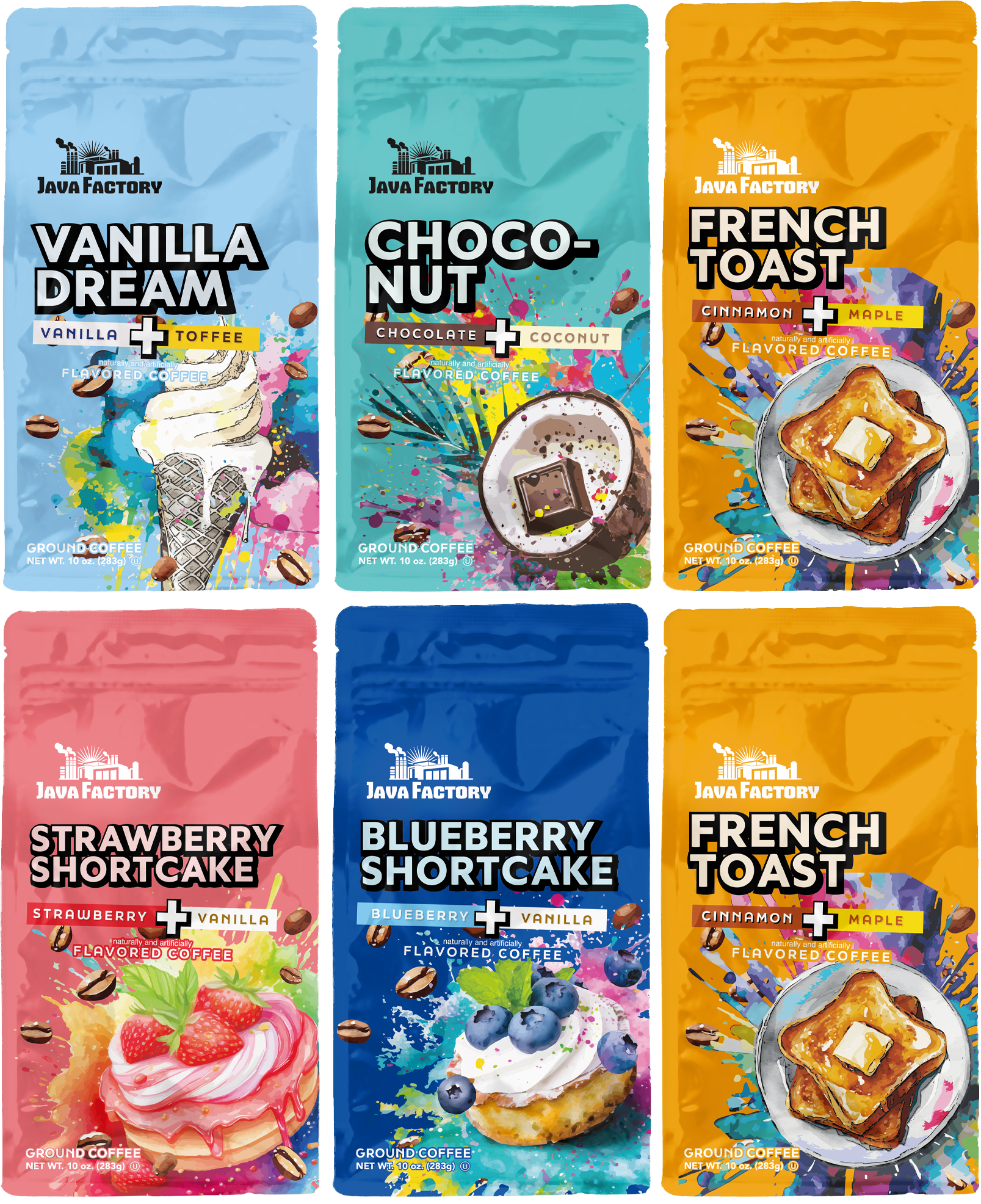 Brew up bold flavor every morning with the Java Factory Ground Coffee Variety Pack. This 6-bag bundle brings you a lineup of crave-worthy blends: Vanilla Dream (vanilla + toffee), Choco-Nut (chocolate + coconut), French Toast (cinnamon + maple), Strawberry Shortcake, Blueberry Shortcake, and more. Each 10 oz bag is roasted to perfection, delivering smooth coffee with a sweet, bakery-inspired twist. Perfect for switching up your morning routine or sharing with flavor-hungry coffee fans.