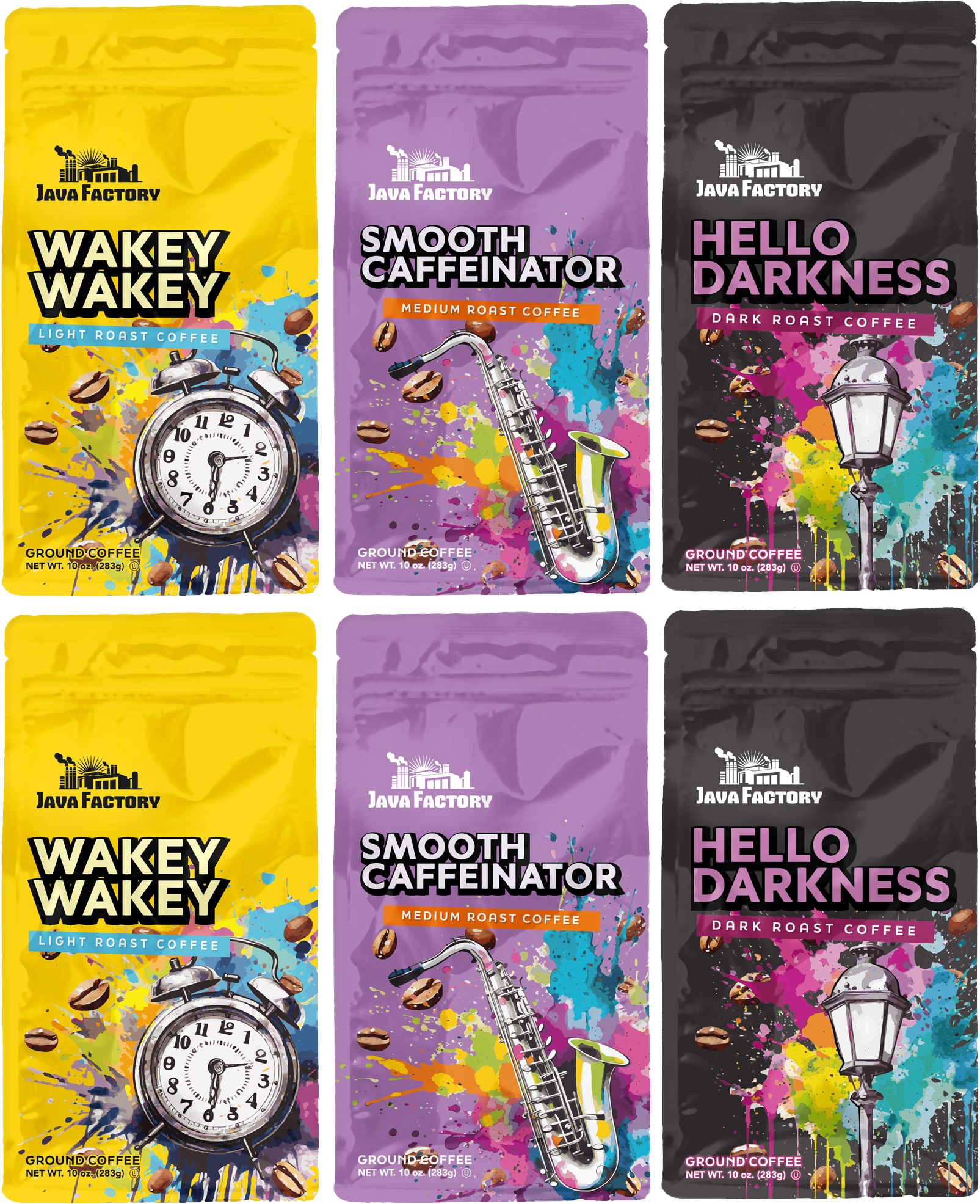 From sunrise sips to late-night brews, the Java Factory Roast Variety Pack has you covered. Featuring Wakey Wakey (light roast), Smooth Caffeinator (medium roast), and Hello Darkness (dark roast), this 6-bag bundle brings the perfect balance of brightness, smoothness, and bold depth to your cup. Each 10 oz bag is roasted with care for a consistently rich, full-bodied flavor—whether you like it light, smooth, or dark and intense.