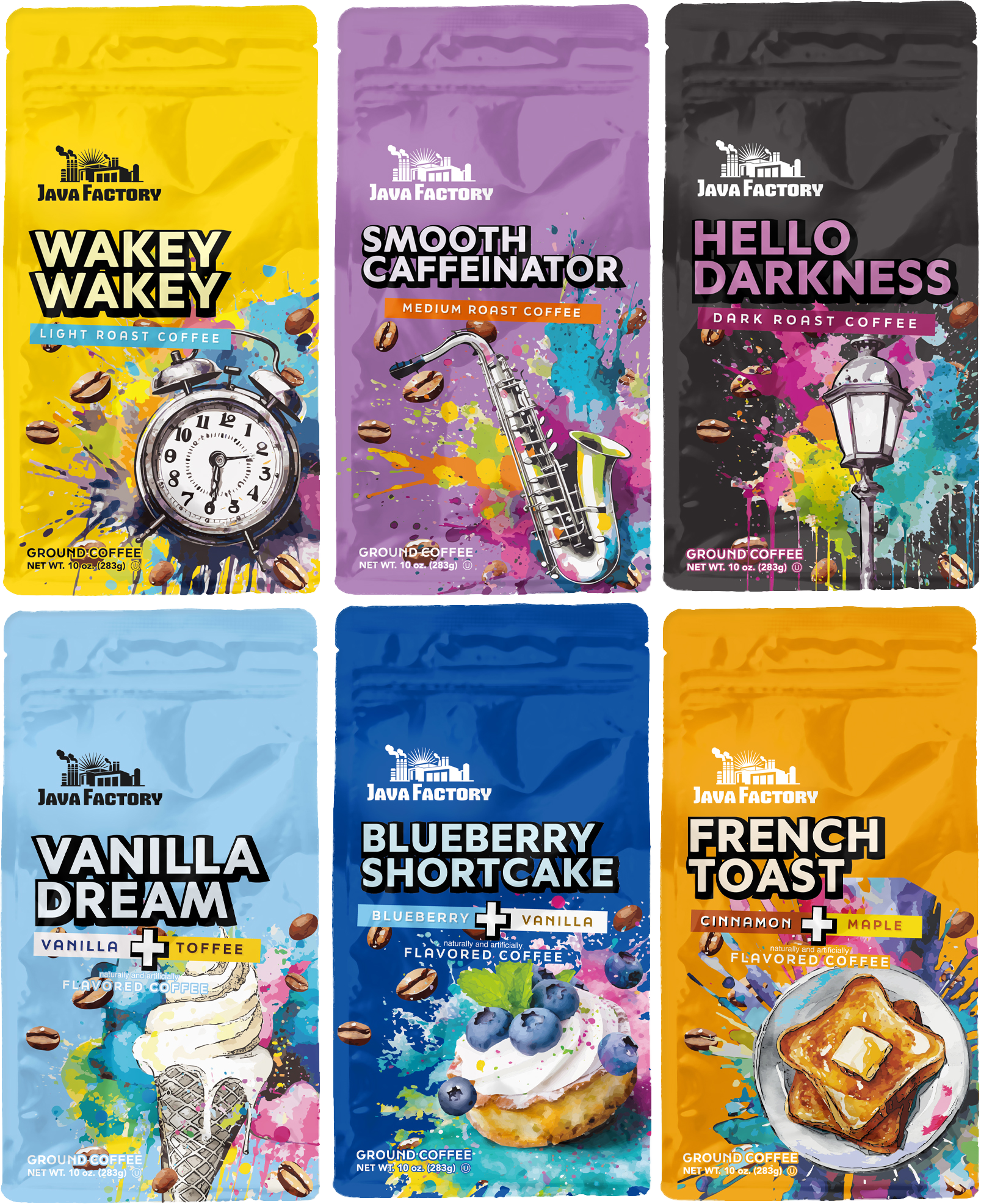 Why choose between classic roasts and dessert-worthy flavors when you can have both? The Java Factory Super 6 Pack brings the best of both worlds with light, medium, and dark roasts—Wakey Wakey, Smooth Caffeinator, and Hello Darkness—plus sweet bakery-inspired blends like Vanilla Dream (vanilla + toffee), Blueberry Shortcake, and French Toast (cinnamon + maple). Each 10 oz bag is small-batch roasted for big flavor and fresh vibes, giving you the freedom to switch it up every morning.